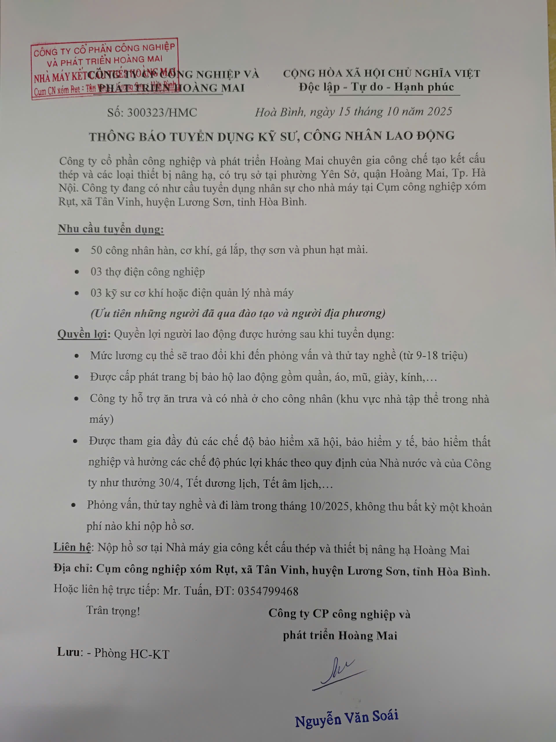 THÔNG BÁO TUYỂN DỤNG KỸ SƯ, CÔNG NHÂN LAO ĐỘNG